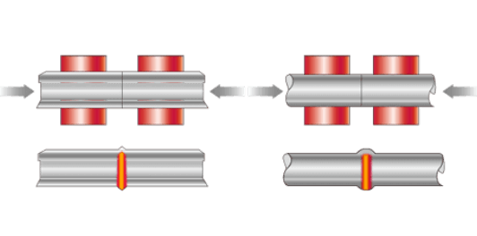抵抗加熱機は電気炉で金属に熱を与えます。アプセットは電気抵抗により端面に発熱が生じ溶接が行う。詳しくは熱溶接とアプセット溶接までご参考.
