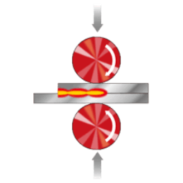 溶接材を円板電極(1個または2個)で挟み、円板電極を回転させながら通電して、電気抵抗による加熱により溶接材を連続的に接合する。線状に溶接できるため、気密性をえることができます。ロールスポット溶接和とシーム溶接2種類分けています。ローラスポット溶接はローラ伝教を用いて、一定の間隔で連続的に行うスポット溶接.ブレーキライニングの溶接に良く使われています。シーム溶接はCWシーム溶接とパルスシーム溶接に分けています。CWシームは冷却時間なしの重ねスポット溶接で、パルスシームは短い冷却時間を設け、重ねスポット溶接を行っていますが、冷却時間が短いため、溶接点はつながっています。同じ設備でCWシーム溶接とパルスシーム溶接できます。板材や溶接の外観で溶接方法を決めます。ローラー電極は内部冷却と外部冷却の対応可能。溶接強度と溶接部品によって選択できます。
